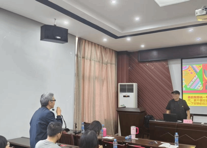 讲座尾声,叶教授同与会师生亲切交流,他勉励师生:面对 AI 时代的机遇与挑战,既要持续夯实专业功底,更要坚持艺术创作的初心与方向。(文 朱世龙/图 王万宝)