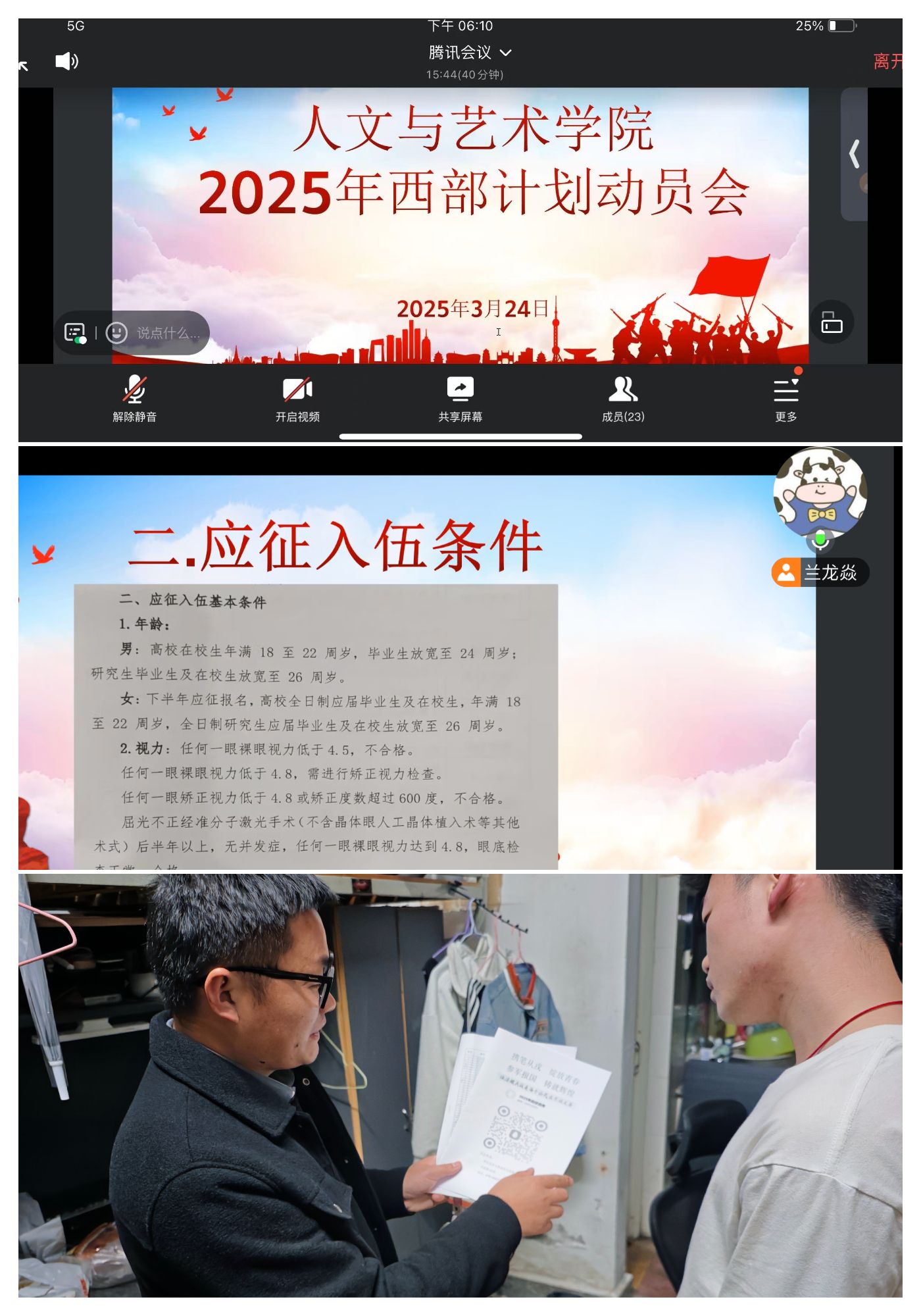 3月24日,人文与艺术学院通过线上会议和线下下寝形式,组织开展西部计划与参军入伍政策宣讲会。