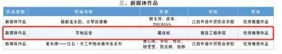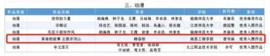 近日,在第七届全国大学生网络文化节和全国高校网络教育优秀作品推选展示活动中,我校新媒体作品《不知后觉》(作者:蒿佳杭)获全国高校网络教育优秀作品推选展示活动“优秀推荐作品”奖(全省共三项),“红色走读”动漫作品《革命的故事 云游井冈山》(作者:赖春怡)获全国大学生网络文化节“优秀入围作品”(全省共五项)。