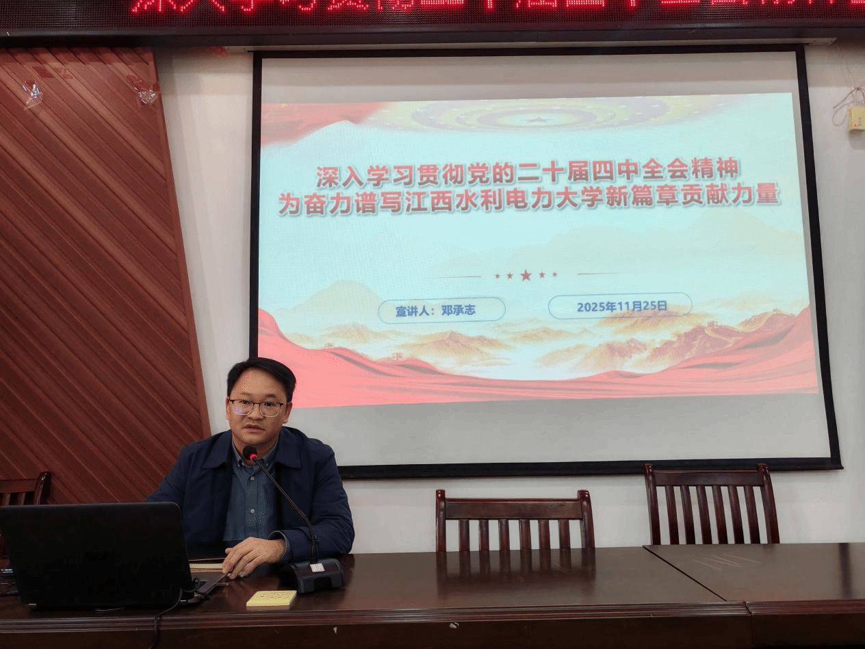 根据学校党委统一安排,2025年11月25日下午,学习贯彻党的二十届四中全会精神宣讲会在艺术楼A230举行。宣讲团成员、科技处处长邓承志以《深刻学习贯彻党的二十届四中全会精神——为奋力谱写江西水利电力大学新篇章贡献力量》为题,开展党的二十届四中全会精神专题宣讲,会议由学院院长万芬芬主持,师生代表90余人现场聆听。