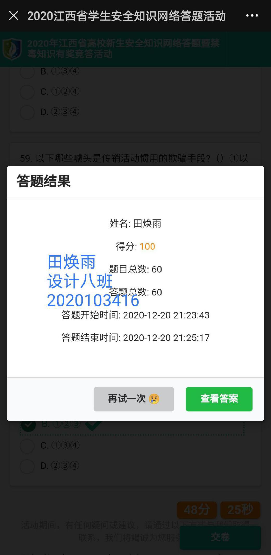 为提高全省师生对禁毒安全知识的了解,加强新生毒品预防工作,江西省教育厅、江西省禁毒办将于12月18日至12月31日在全省开展大学新生安全知识网络答题暨禁毒知识有奖竞答活动。通知下发后,我院精心落实,认真有序组织学生按时参赛。